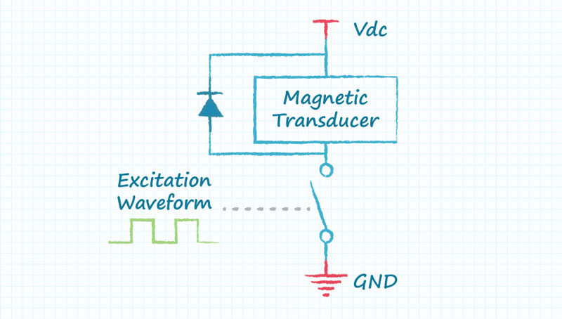 Figure 4 shows the application circuit for a magnetic transducer. The switch is typically a bipolar transistor or FET and is used to amplify the excitation waveform. Because of the coil’s inductance, the diode shown in the diagram is needed to clamp the flyback voltage when the transistor is turned off quickly.