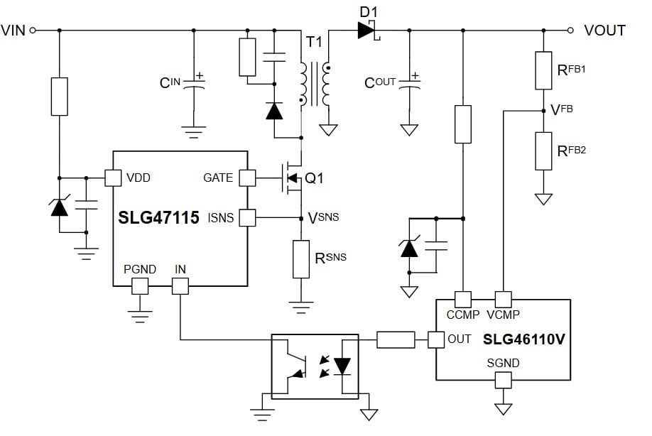 This article is based on AN-CM-420 SLG47115 and SLG46110V Isolated Flyback Controller and explains how to design and build an isolated DC-DC flyback controller using the SLG47115 as a low-side N-MOSFET controller and using the SLG46110 for isolated feedback via an optocoupler. It comes complete with Go Configure Software Hub design files as well as an Excel-based calculator tool for creating other flyback regulators with varying sets of input voltages, output voltages, output currents, and switching frequency ranges.