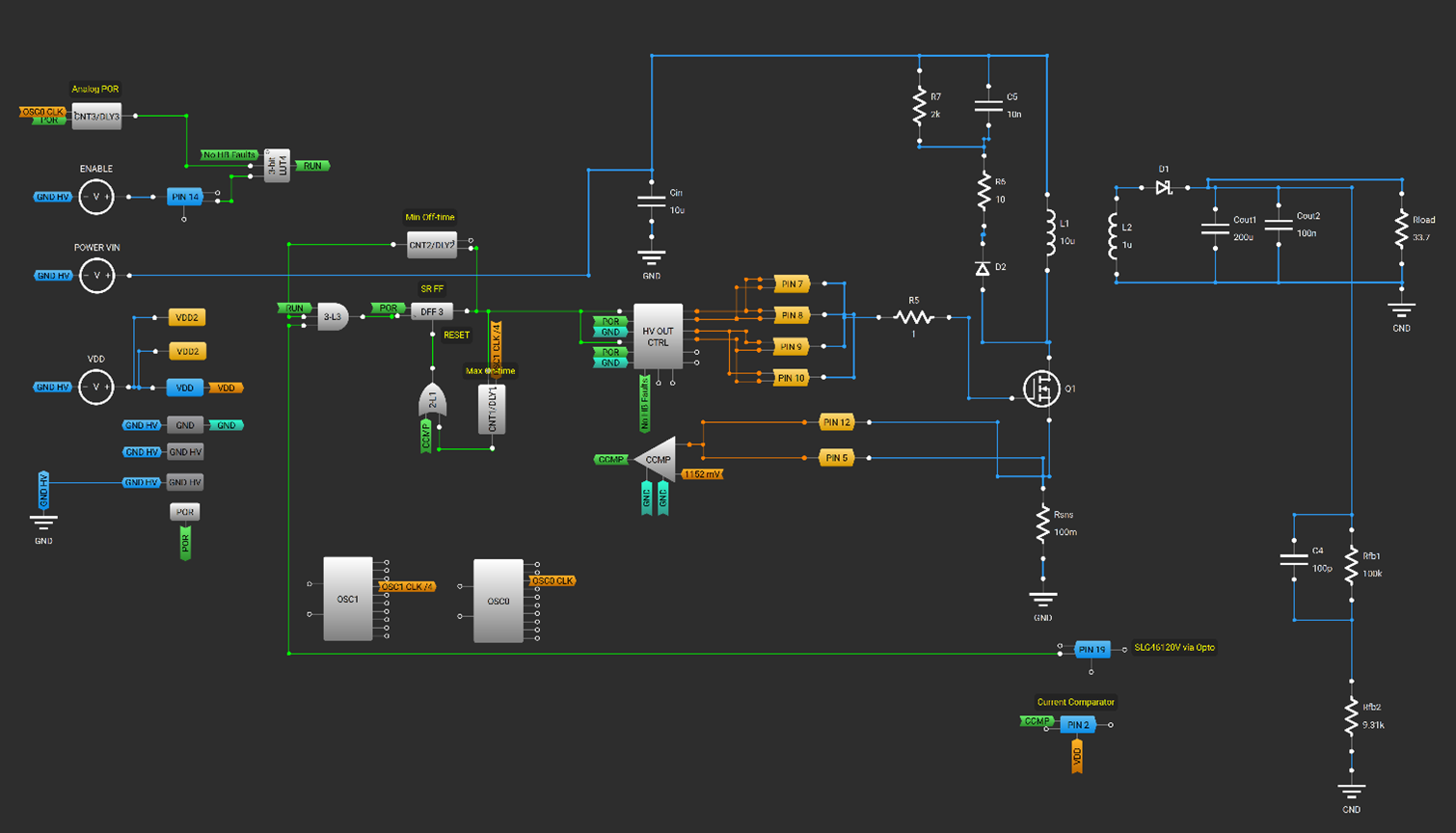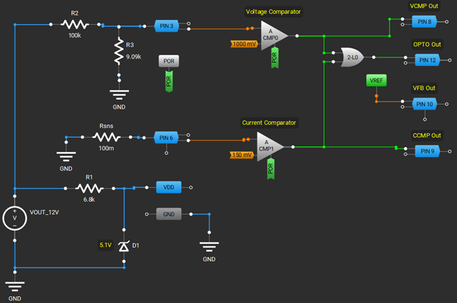 In the SLG46110’s VCMP and CCMP outputs are OR’d together so that either one can turn Q1 back on.