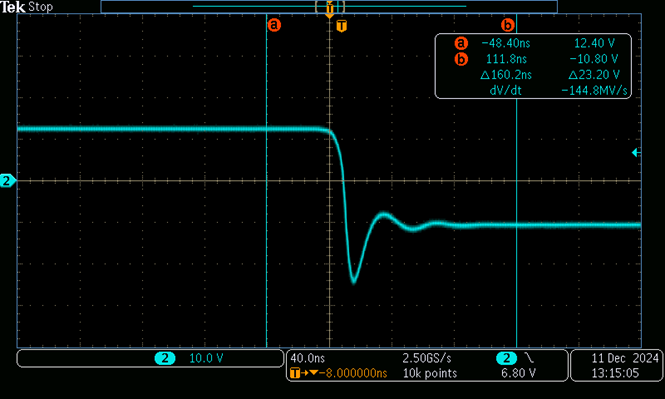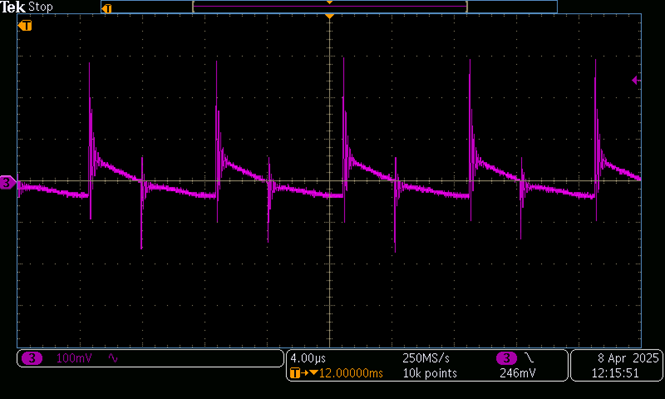 The predicted ripple looks much lower than the limit on paper, but lab testing without the 10 µF MLCC C16 showed higher ripple due to parasitic capacitances and inductances in the components and the PCB, shown in Figure 7.