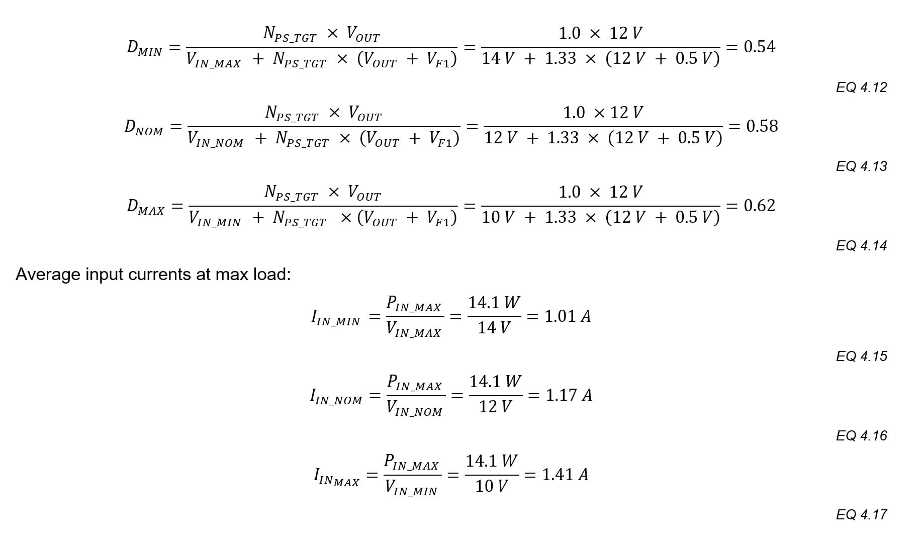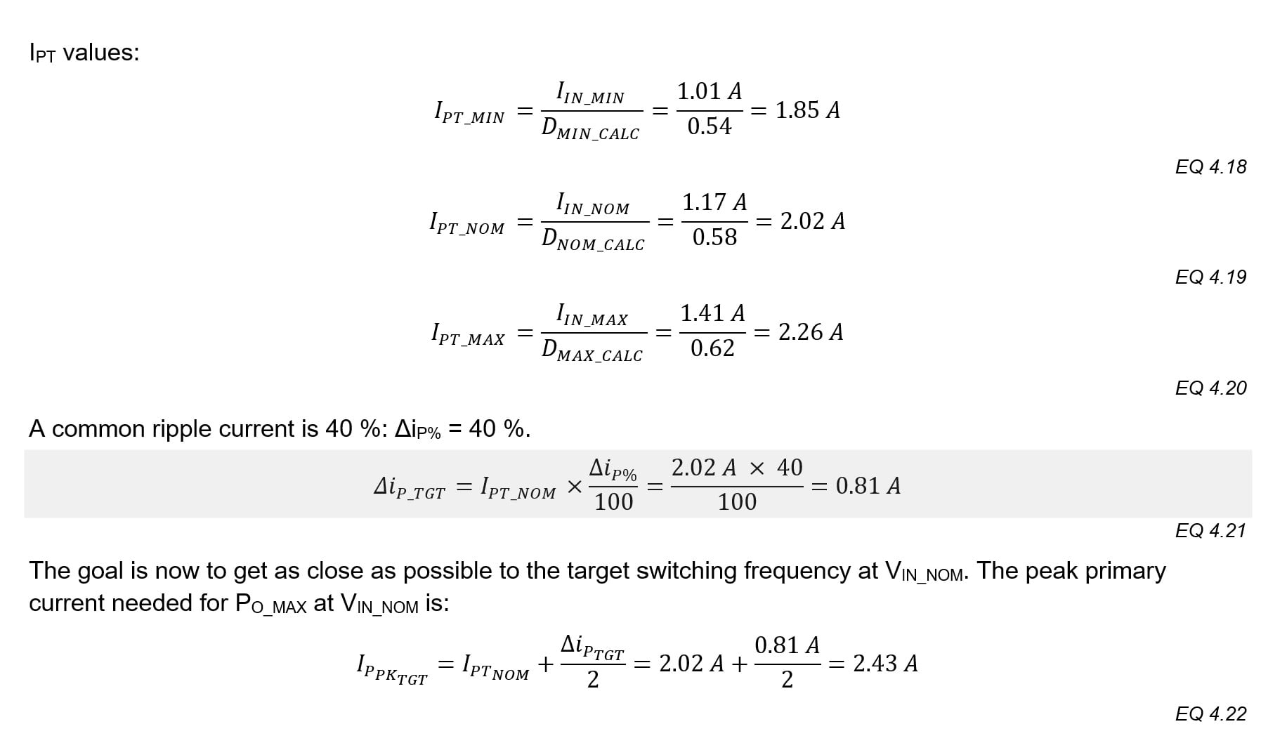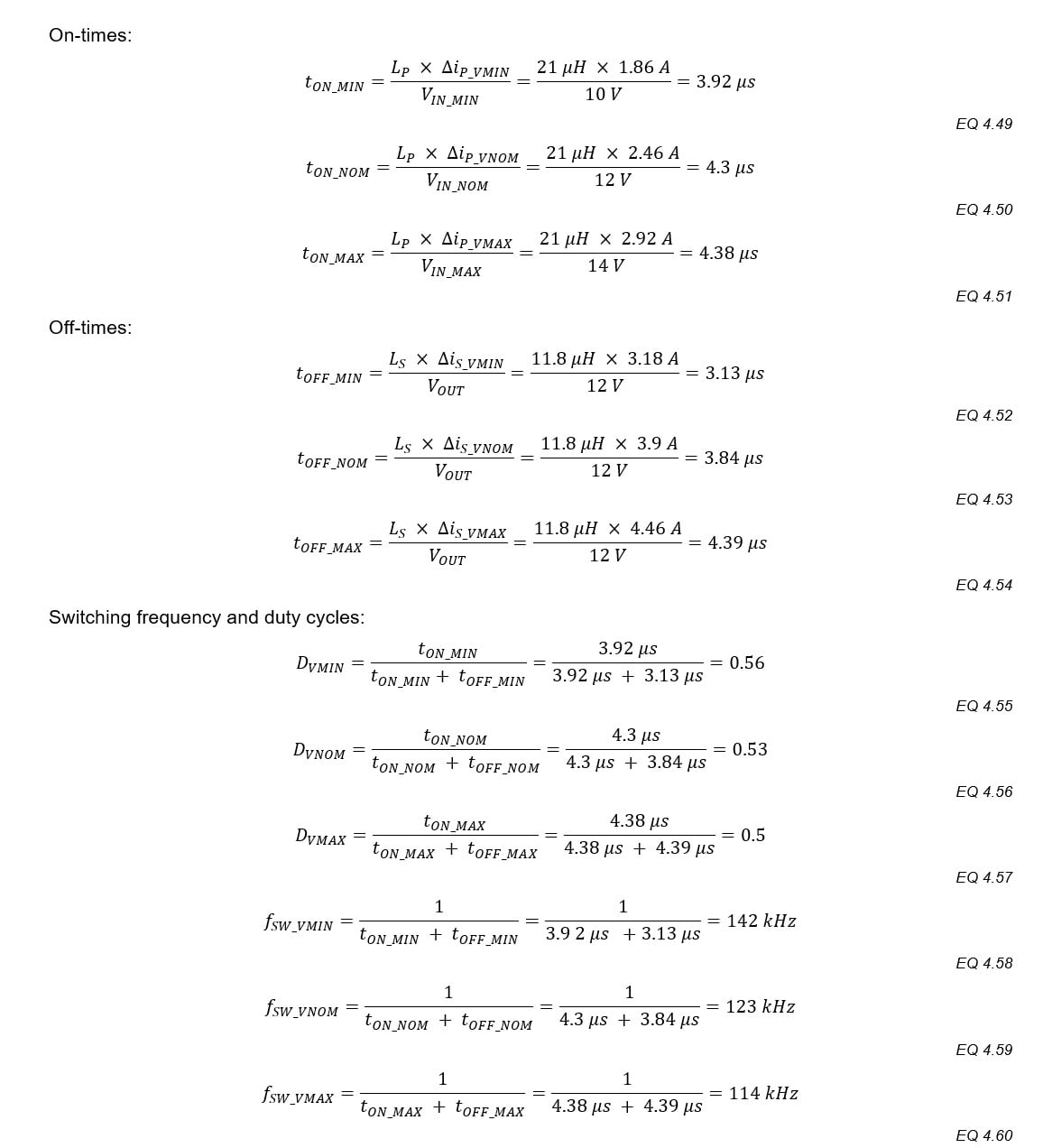 With T1’s inductances and currents calculated, the on-times (when Q1 conducts) and off-times (when D1 conducts) are re-evaluated more accurate duty cycle and switching frequency predictions.