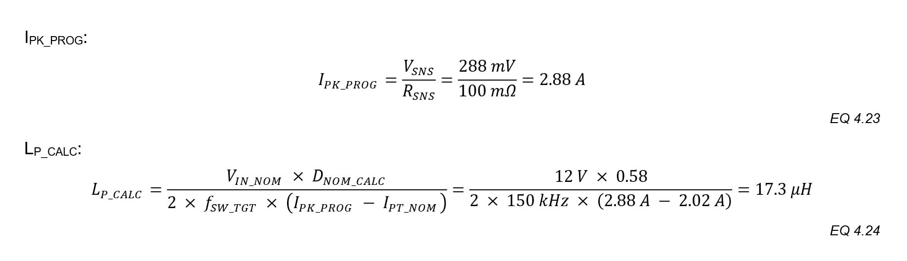 The user programs the actual peak current by selecting the current sense voltage and the sense resistor. Starting with a current slightly above IP_PK_TGT is recommended. A sense voltage of 100 to 500mV provides a balance between good accuracy and low power dissipation at this power level. 100mΩ is available with 1% tolerance in many sizes and powers.
