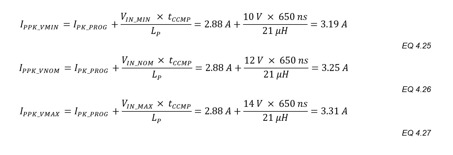 The 650ns (typical) total response time for the CCMP is a source of error in the peak primary currents during turn-off. These 650 ns are added to the calculated on time and yield higher peak primary current. The increase varies with VIN: