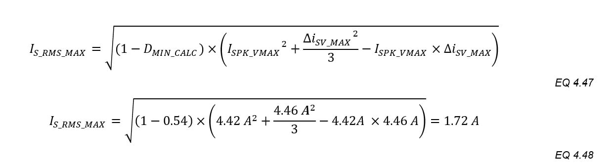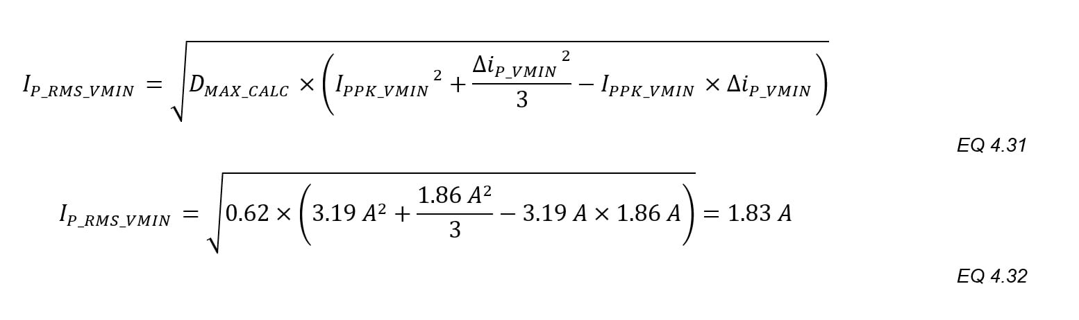 The worst-case secondary RMS current is used to predict the losses in D1 and in calculation of the AC ripple current in the output capacitor(s). The highest secondary RMS current occurs at the maximum input voltage: