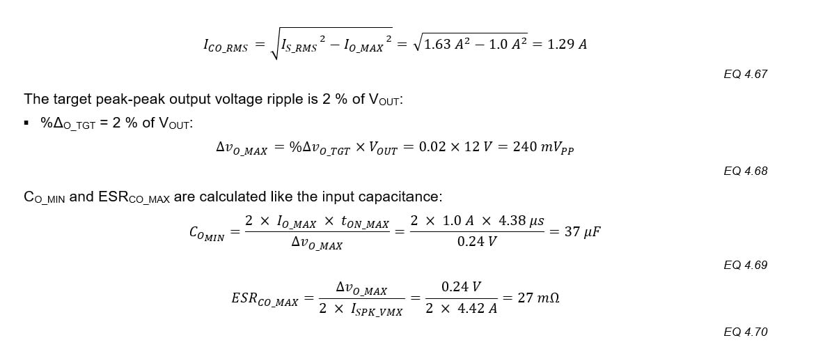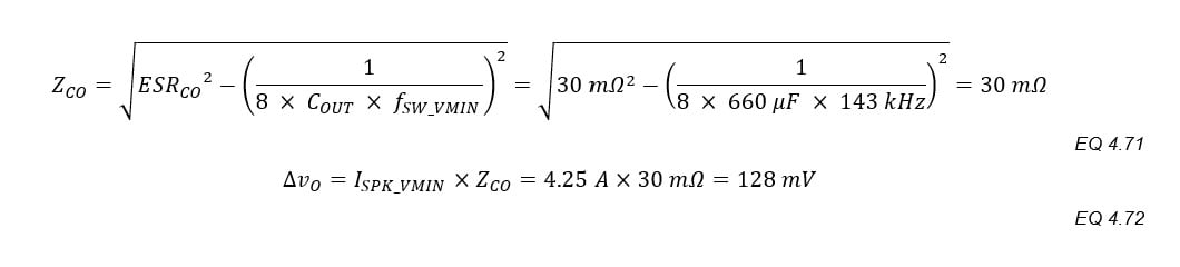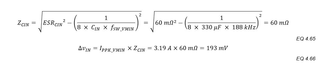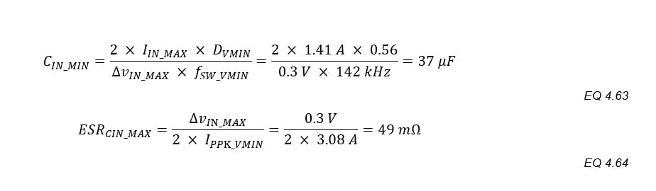 CIN_MIN and ESRMAX are calculated based on ΔvIN_MAX. The factors of “2” assume that half of ΔvIN comes from the discharging of the input capacitors and half from IP_PK flowing through the ESR.