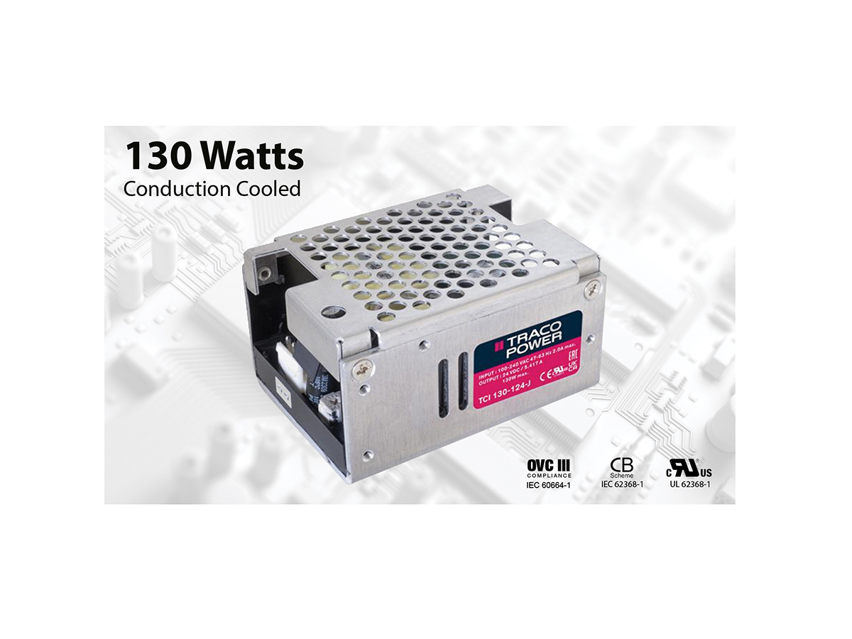 The TCI 130 series consists of 3 single output models with 12, 24, or 48 VDC outputs and are designed to maximize both efficiency and thermal performance. Up to 91% efficiency allows conduction-cooled operation from -30 to +50°C without derating (see app note for operation up to +80°C). Active power factor correction, internal EN 55032 class B filter (conducted & radiated), over voltage category (OVC II & OVC III) compliance, 4250 VAC reinforced isolation, and a high reliability of 250’000 hours (MIL-HDBK-217F, ground benign) make the TCI 130 ideal for instrumentation, industrial, ITE and IoT applications. Features include: