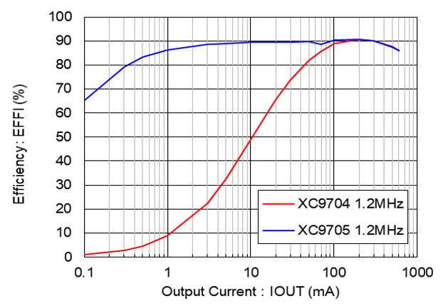With selectable oscillation frequencies of 1.2MHz or 2.2MHz, the XC9704/XC9705 series allows the use of compact peripheral components such as coils and capacitors, achieving a compact mounting area of just 48.7mm². Additionally, with an ultra-low quiescent current of 11μA, the efficiency reaches 90% under conditions of VIN=12V, VOUT=5V, and IOUT=1mA, maintaining high efficiency from light to heavy loads.
