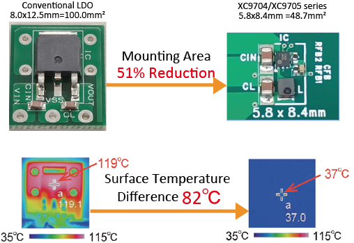 These features make the XC9704/XC9705 series ideal for replacing conventional medium to high voltage LDOs, which often have heat generation and size issues.