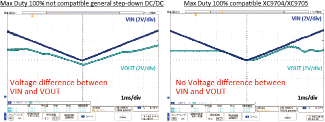 Moreover, unlike traditional N-channel driver FETs often used in medium to high voltage DC/DC converters, the XC9704/XC9705 series adopts a P-channel driver FET which allows 100% duty operation. This makes the device possible to pass through the input voltage as is even when the input voltage drops below the output voltage setting, ensuring stable operation even with minimal differences between input and output voltages.