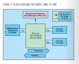 The-bi-directional DC source acts as the supply of the VPOS and is in CV mode. The other DC source is connected to the output of the VNEG. This DC source controls the amount of current that is sunk into the system. A blocking diode is connected in series with this DC source to ensure that no current will flow into it when the converter is sourcing current. The e-load is used as the initial load to show that the system is capable of transitioning from sourcing to sinking and vice versa.