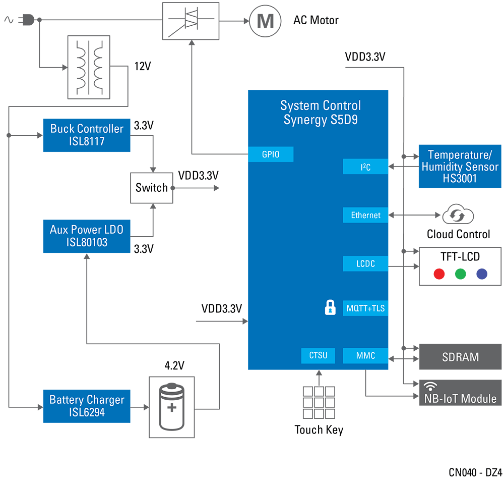 In the case of a vending machine, a combination of battery charging and AC power is more suitable. For today’s vending machines, the Renesas Synergy S5D9 microcontroller has on-chip hardware security, LCD controller and qualified Synergy Software Package (SSP) for quickly connecting to the cloud. This can be used with IDT’s HS300x humidity and temperature sensor with power support from Intersil’s ISL8117 DC/DC controller, ISL6294 battery charger and an ISL80103 low voltage, single output 3A linear regulator.