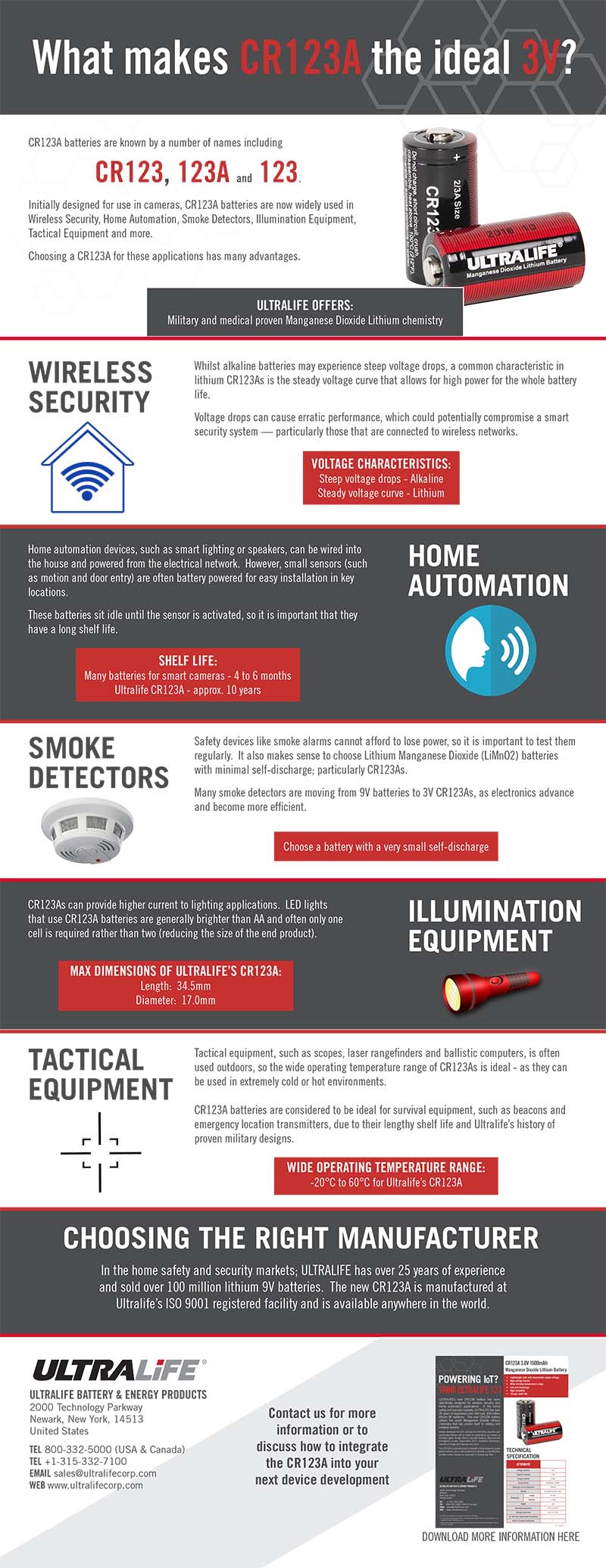The infographic showcases the range of applications that Ultralife’s CR123A can power today, from home automation sensors to tactical military equipment including scopes. It highlights the benefits that Ultralife’s CR123A battery offers to design engineers that are developing these devices, such as a compact profile, a wide operating temperature range and a ten-year shelf life.