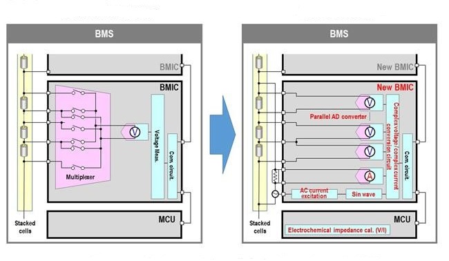 Conventional BMIC measures the individual battery voltage of six to 14 lithium-ion battery cells stacked in series. By using multiple BMICs, the BMS acquires battery cell voltage data from up to 200 cells connected in series, monitors the battery, and ensures its safe use. In addition, BMS calculates the remaining driving range and usable time by estimating the state of charge, as a percentage of the remaining capacity with respect to the full charge capacity, and the state of health (SOH).