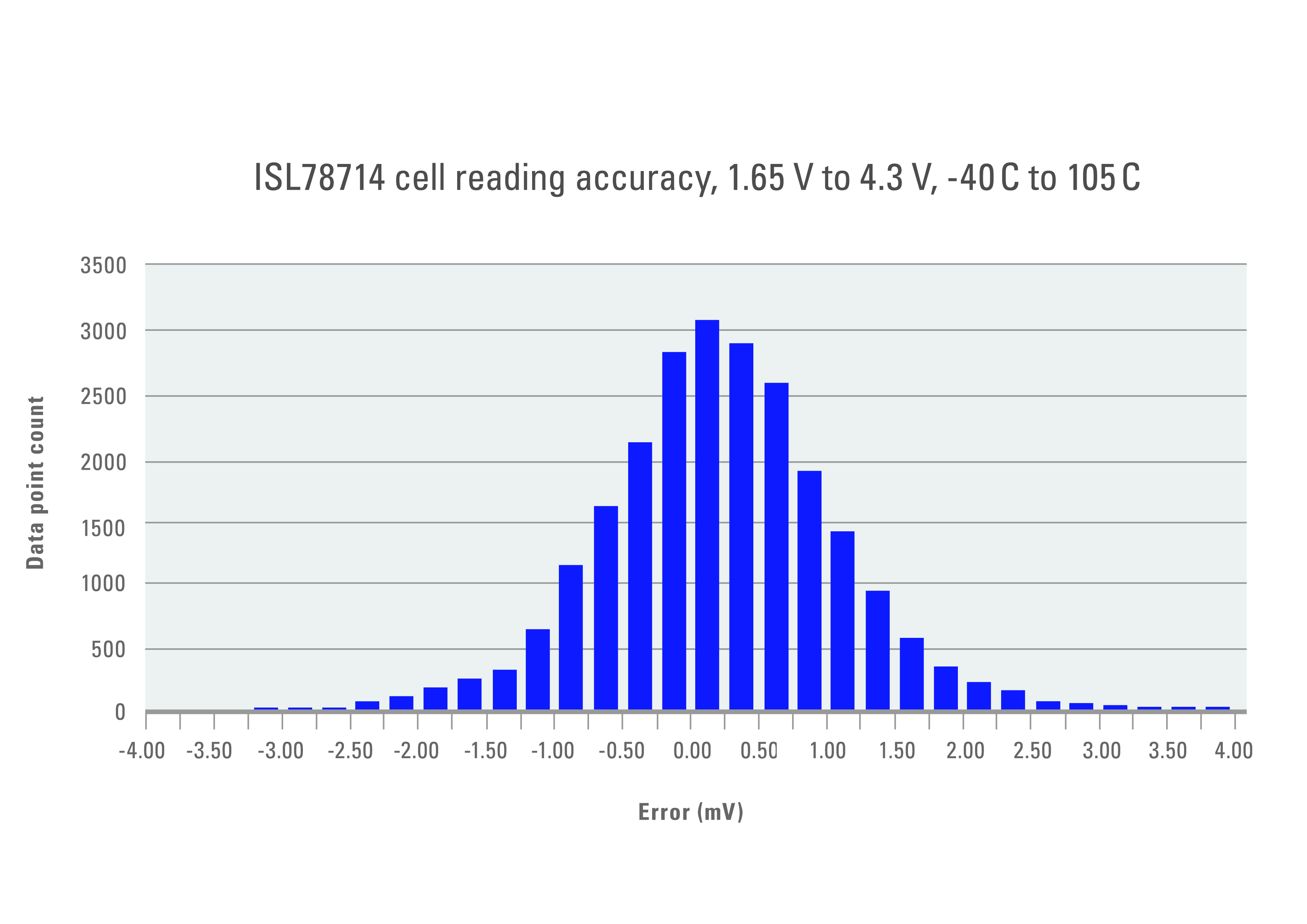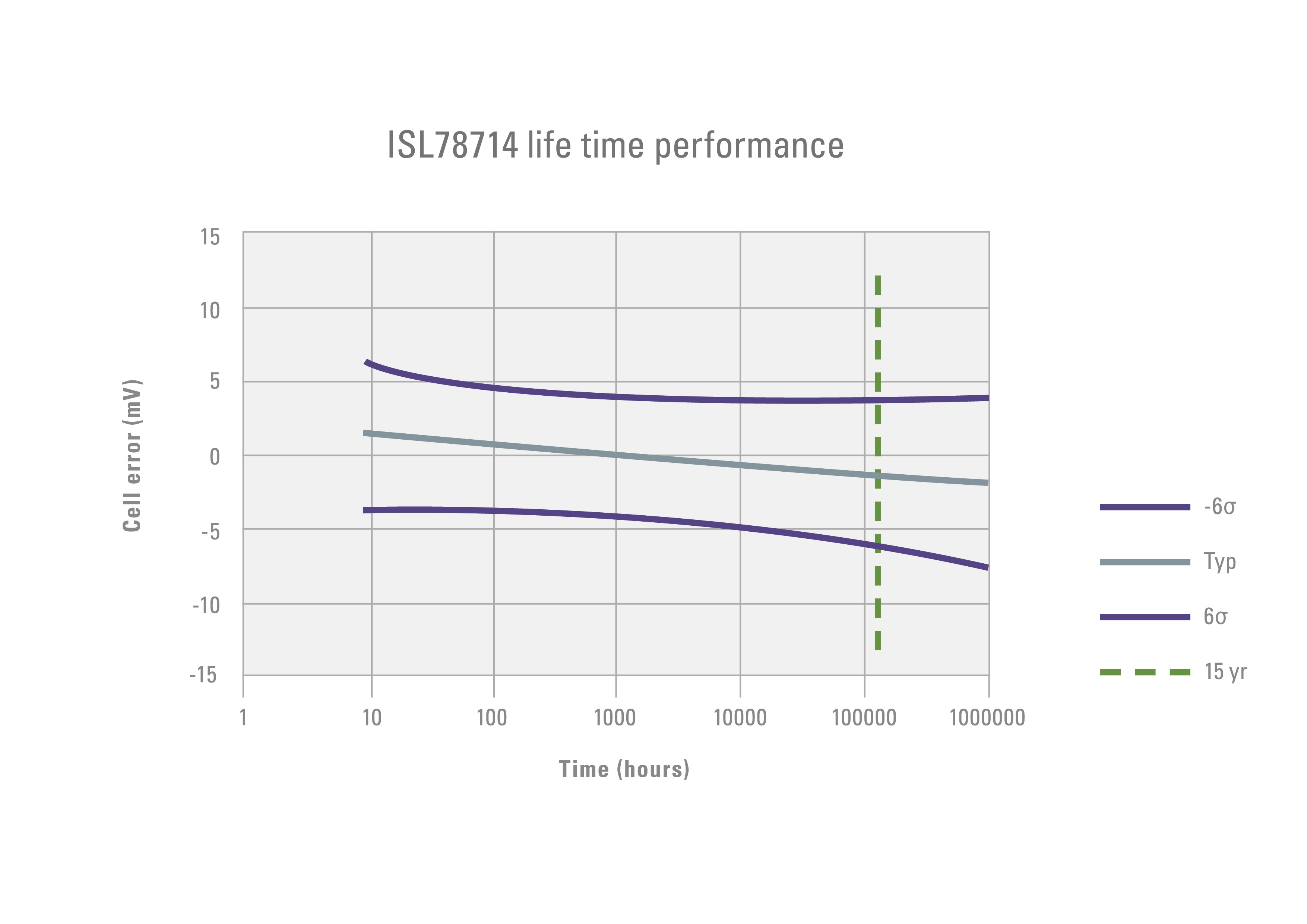 BMS designers who, for example, follow the ISL78714’s recommended PCB layout guidelines and soldering reflow profiles, will see that the IC’s board level cell reading accuracy and long-term drift characteristics are both logarithmic and predictable. The IC’s long-term drift performance is obtained from laboratory testing at 25°C and accelerated life testing. Accuracy over life is a vector addition of initial board level accuracy and lifetime drift, e.g. sum mean values and RSS standard deviations (see Figure 3).