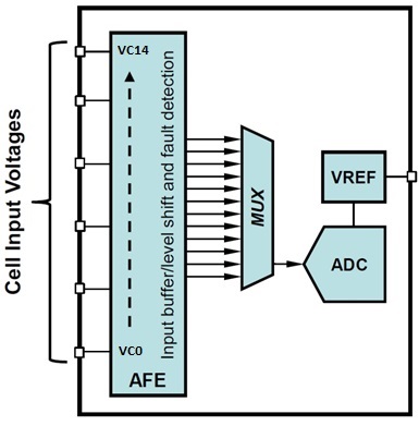 The individual cells interface is managed by the AFE, which comprises input buffers, level shifters and fault detection circuitry. The AFE is key to handling hot plug transients when the cells are initially connected to the BMS. The BMS IC is designed with a differential AFE that enables negative input voltages (±5V) to be measured without affecting the adjacent cell measurements. This is advantageous in systems where bus bar interconnection is required. To improve robustness under transient conditions, an external low-pass filter is added to the cell voltage inputs.