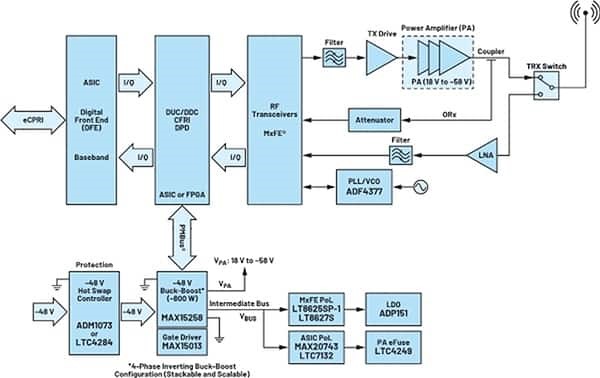 A typical application of this versatile IC is the power supply for a 5G macrocell or femtocell shown in Figure 2. The hot-swap feature is ensured by a negative voltage hot-swap controller, such as ADI’s ADM1073, powered by -48 VDC. The same voltage supplies the MAX15258 buck/boost converter, which is capable of providing up to 800W of output power.