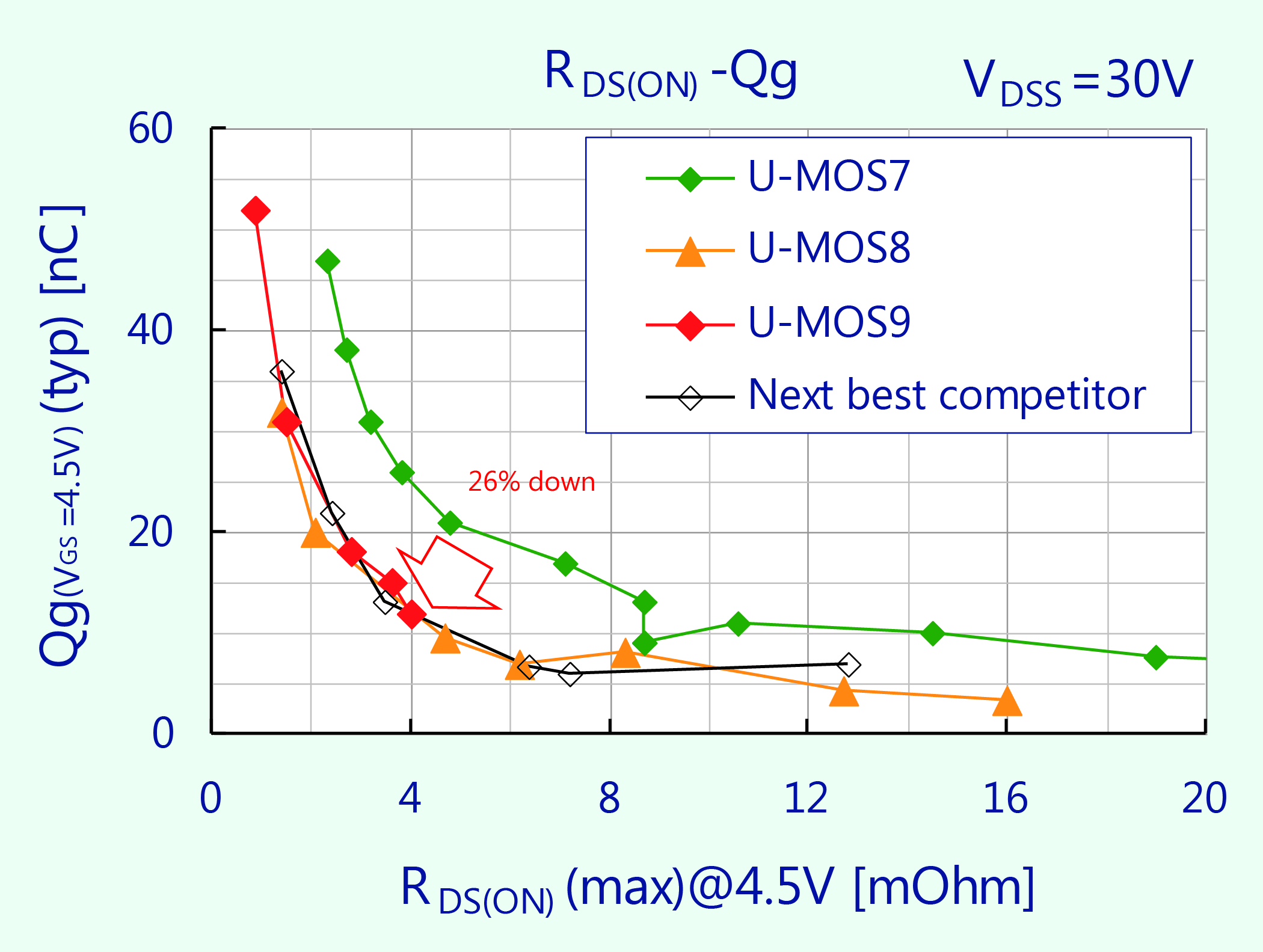 Figure 3: RDS(ON) versus Qg has improved by 26% compared to previous UMOS technology generations