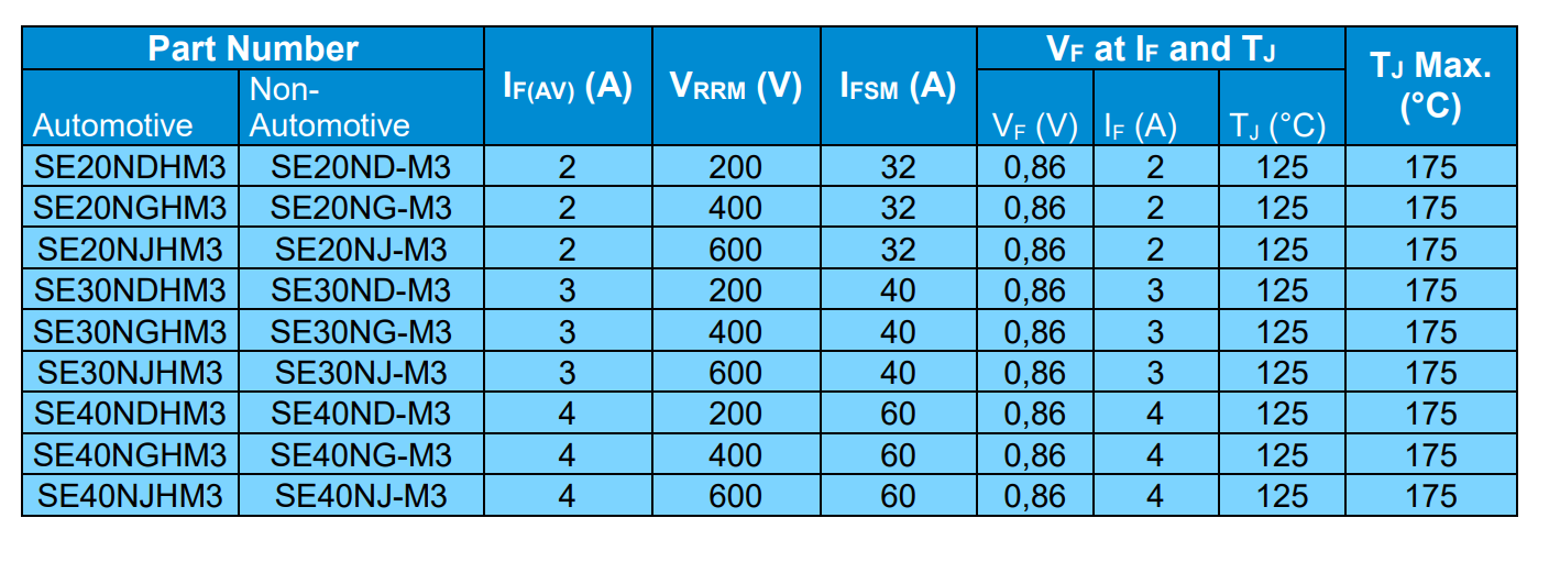 Vishay Intertechnology introduces three new types of standard surface mount rectifiers for automotive applications. The SE20Nx (2A), SE30Nx (3A), and SE40Nx (4A) offer space-saving solutions with efficiency and operate reliably at operating temperatures of –55 °C and +175 °C.