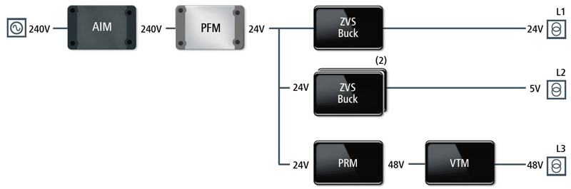 The PFM and AIM take a universal AC mains voltage of 85-265V, and convert it directly to a 24V hub voltage, which was used to power three rails. Two of the rails used ZVS Buck Regulators, one providing a regulated 24V and the other a regulated 5V. Packaged in an LGA SIP, these ZVS Buck Regulators are 2.56mm high, and require minimal additional external components.