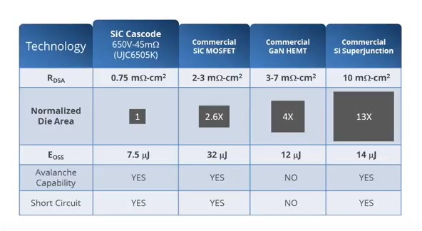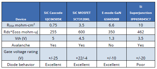 • There is energy lost in switching, Eoss, associated with Coss. In the 650V class of devices, a SiC cascode at around 6.5μJ has half the value or better than comparable Si- or SiC-MOSFETs.