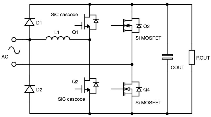 This forces ‘critical conduction’ mode to be used, which sets switching current to zero at the end of each conduction period. However, this variable-frequency mode produces high peak currents and high EMI. Using cascode SiC JFETs, ‘continuous conduction’ mode can be used, increasing efficiency, reducing inductor size and easing filtering and EMI problems with fixed operating frequency. An example circuit using UnitedSiC UJC06505K devices at 1.5kW and 230VAC-line showed an impressive efficiency of 99.4%.