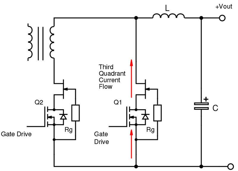 Achieving high efficiency in converter primary switches must be matched with similar improvements in rectification for DC outputs. Again, SiC cascodes fit here as they can be configured for ‘synchronous rectification’ (Figure 11). In so-called third-quadrant operation current flows from source to drain of one or other of the cascodes through the output inductor to load during the ‘forward’ and ‘flywheel’ periods of forward or buck-derived converters.