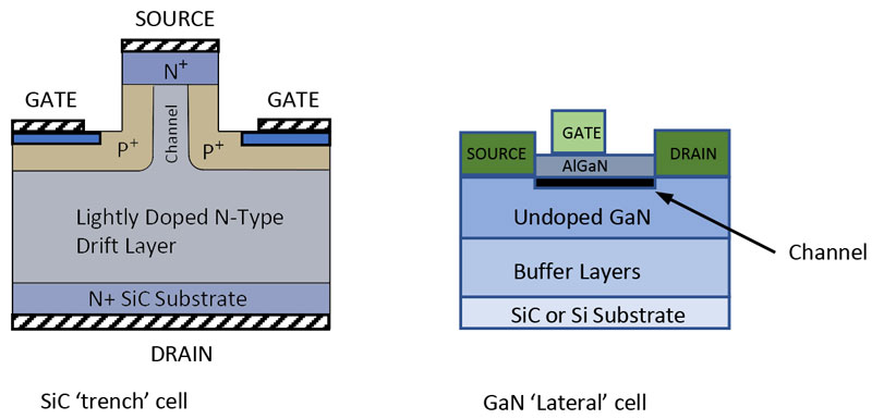 Devices initially available in SiC were simple diodes, but the material technology has advanced to enable fabrication of JFETs and MOSFETs. Figure 1 shows a cell of a SiC JFET with a vertical trench construction giving very low ON-resistance, compared with a GaN High Electron Mobility Transistor (HEMT) cell with lateral construction.