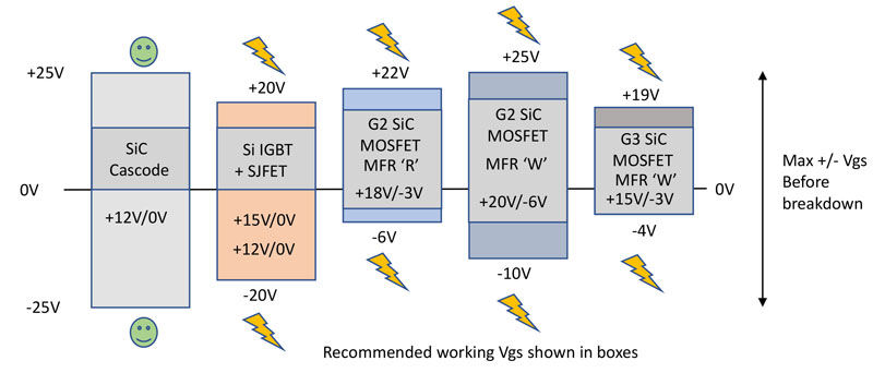Figure 6. SiC cascodes encompass other allowable gate-drive voltage ranges