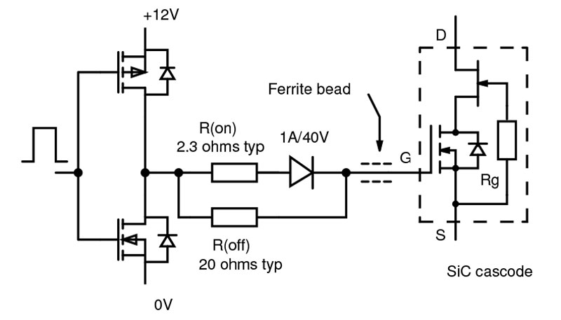 A typical gate-drive circuit for SiC cascodes is given in Figure 7. Note that unusually, R(on) is typically lower than R(off), which should have a minimum value of about 10Ω to avoid internal oscillation in the cascode. The series ferrite bead is optional for damping.