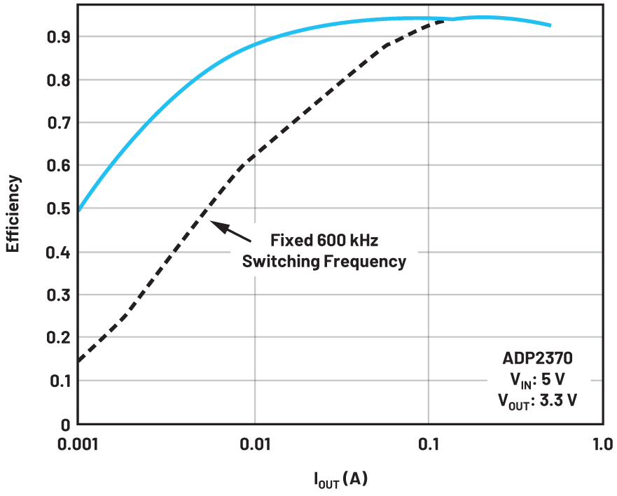 Figure 2. The power conversion efficiency of an ADP2370 buck regulator with low load power saving mode activated and with fixed 600kHz switching frequency at all loads.