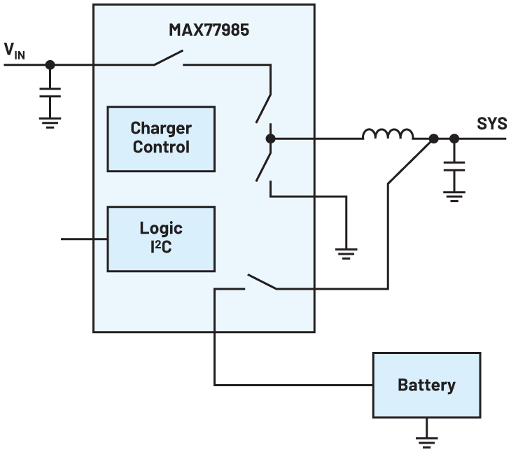 Among many different features, one item is especially noteworthy. The integrated power switches in the MAX77985 can not only be used in step-down mode for charging the battery but the switches can also be used to boost the battery voltage to a higher system voltage. In a way, this specific battery charger combines the system power converter with a pure battery charger.