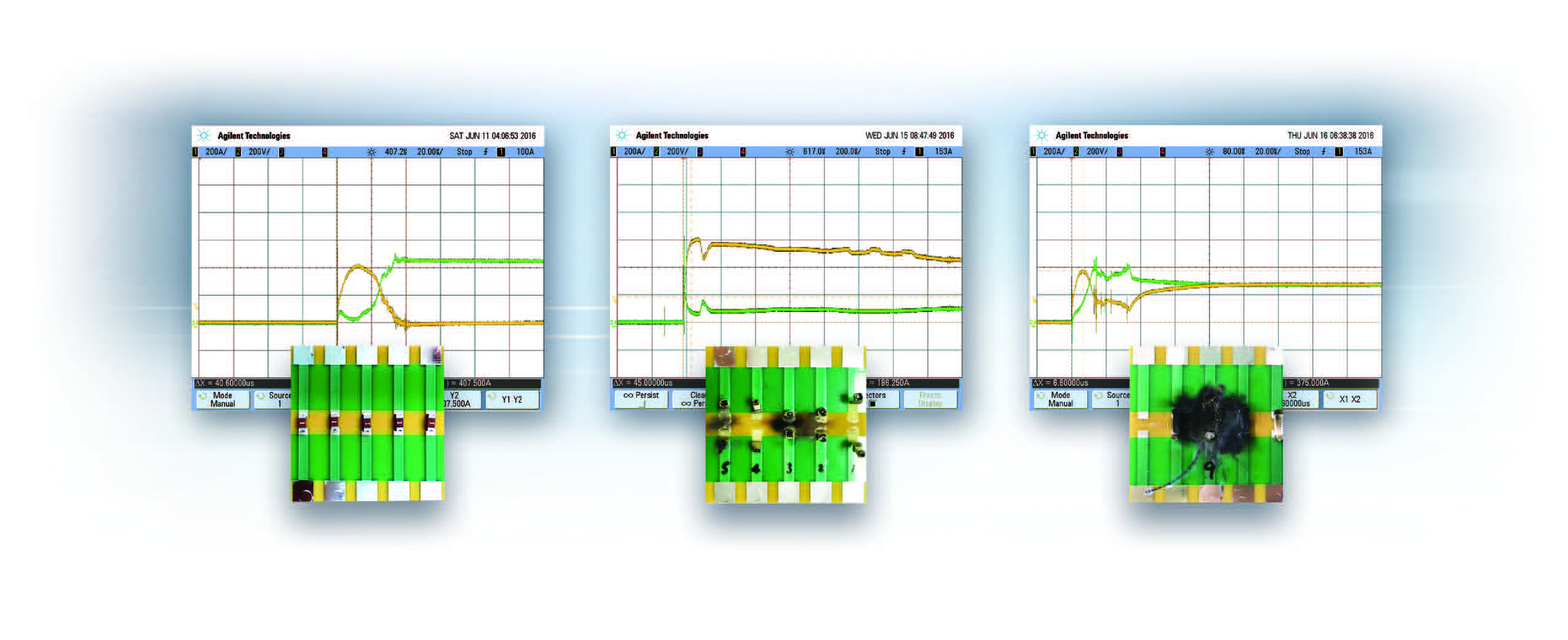 The AEM Components’ fuses withstood 450V/450A conditions (shown left) without any external damage. Conventional fuses (sample A at 250V/250A (centre) and sample B at 450V/450A -shown right) exhibited significant damage to the fuse and collateral damage to the surrounding circuitry. In the waveforms above, the current flow (yellow trace) through the AEM fuse drops to zero while samples A and B each display secondary current flow that ultimately results in PCB damage. The voltage (green trace) shows an open circuit for the AEM fuse with no secondary conduction.