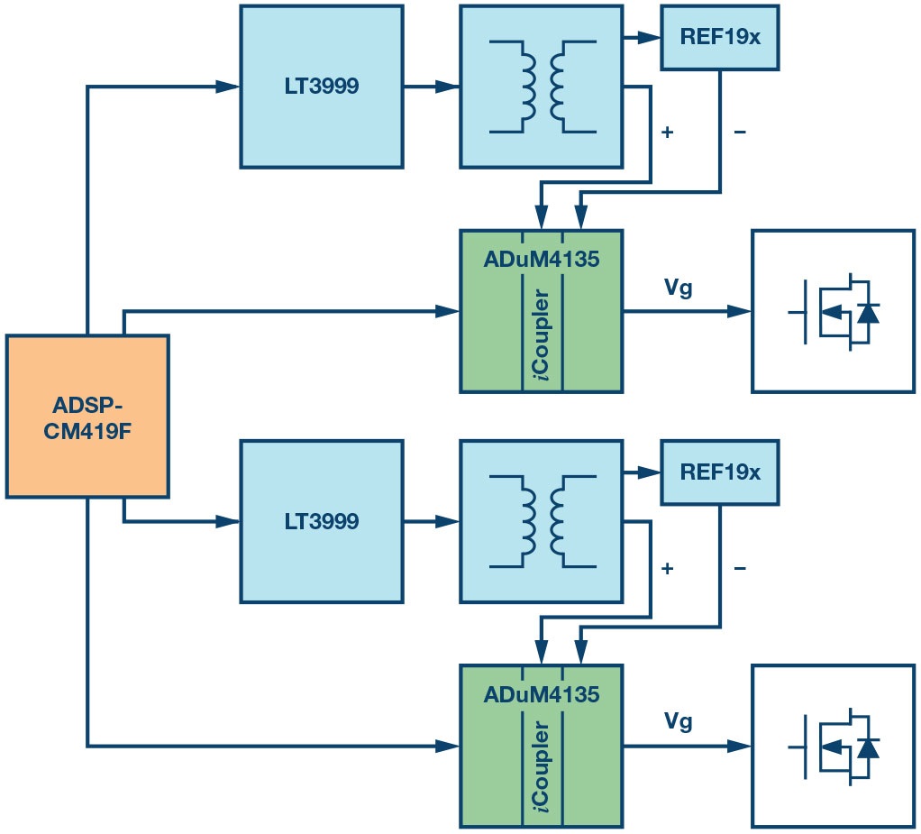 Figure 4 shows the main components in the power switch drivers, from the LT3999 DC/DC transformer driver generating the positive gate voltage level to the REF19x (or LT1121x) high efficiency linear regulator making the negative gate voltage level, to the ADuM4135 isolatedgatedriver.ThemaincontrollerisrepresentedbytheADSP-CM419F processor, which can be embedded in the boards or connected with high frequency cabling and generate the PWM signals for the isolated gate drivers.
