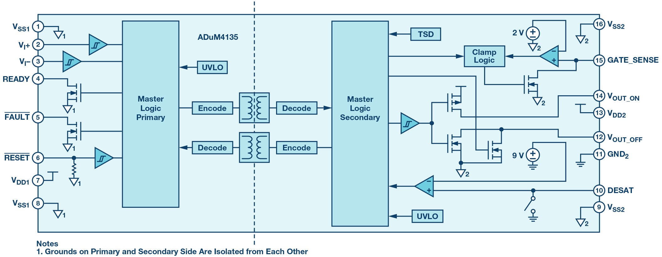 The ADuM4135, in a 16-lead, wide-body SOIC package, includes a Miller clamp to provide robust SiC/GaN MOS or IGBT turn-off with a single-rail supply when the gate voltage drops below 2V.Operation with unipolaror bipolar secondary supplies is possible. A desaturation detection circuit provides protection against high voltage, short-circuit switch operation. The desaturation protection contains noise reducing features,such as a 300ns masking time after a switching event to mask voltage spikes caused by initialturn-on. An internal 500µA current source allows for a low device count and the internal blanking switch allows for the addition of an external current source if more noise immunity is needed. The secondary UVLO is set to 11V, with common IGBT threshold levels taken into consideration. iCoupler chip scale transformers also provide isolated communication of control information between the high voltage and low voltage domains of the chip. Information on the status of the chip can be read back from dedicatedoutputs.Thecontrolforresettingthedeviceafterafaultonthe secondary is performed on the primary side of thedevice.