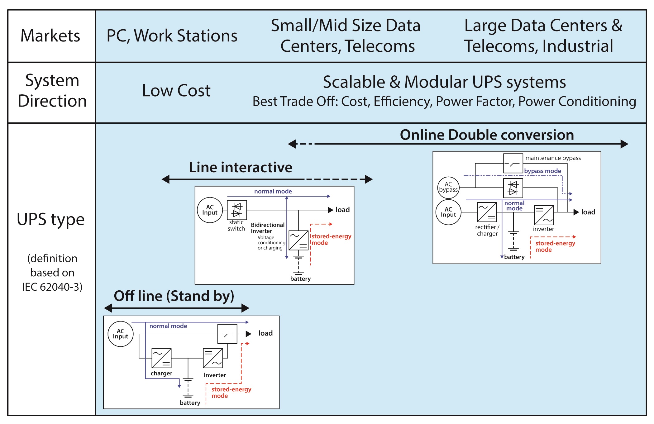 Figure 1: The three main UPS types in common use and their applications