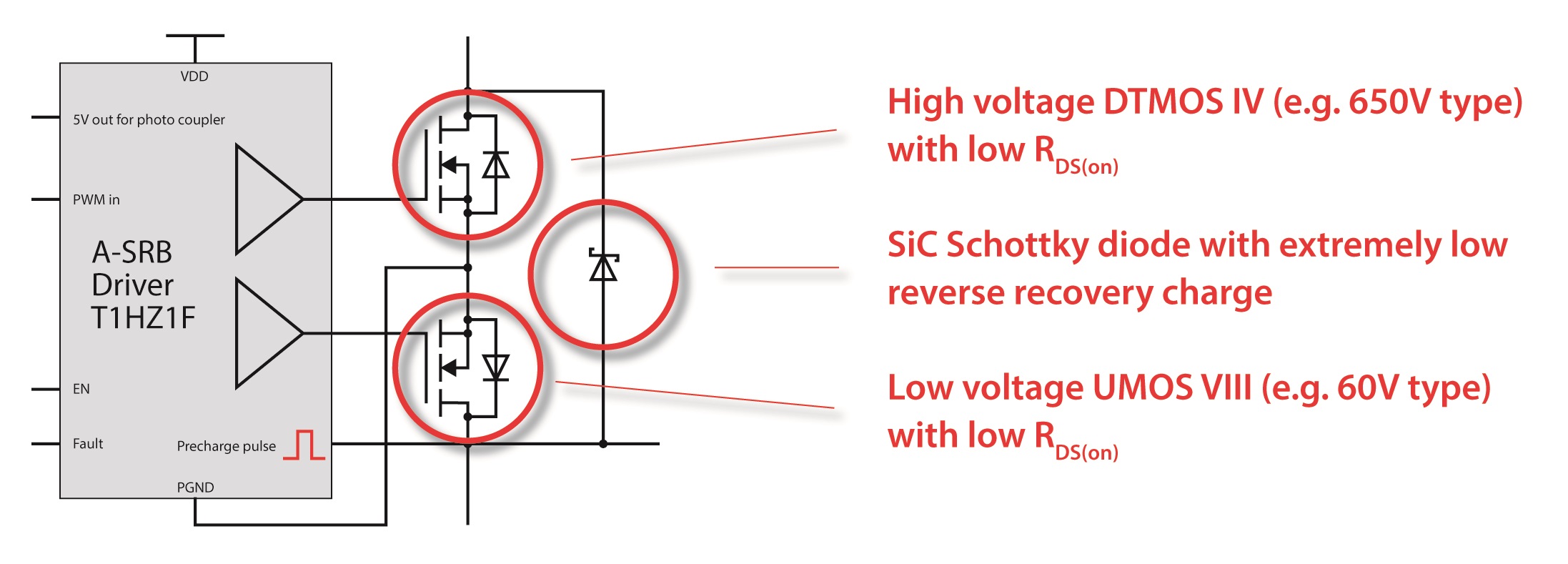 Synchronous reverse blocking (SRB) is a technique that blocks the reverse current using a synchronously controlled transistor and channels the resulting reverse current through a SiC diode, thereby significantly reducing the impact of Qrr.