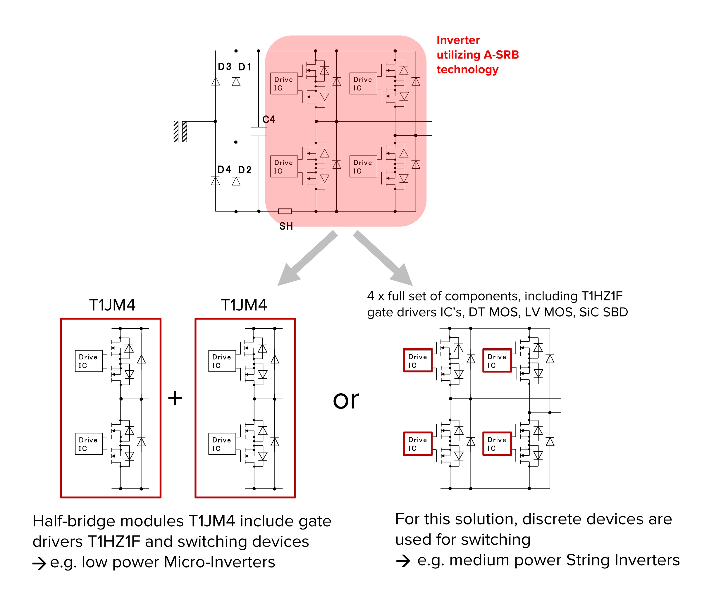 Several solutions are available to implement A-SRB functionality, depending upon the required power level. The T1JM4 module is a complete A-SRB solution for power levels up to 300W that integrates the gate drivers, switching transistors and SiC Schottky diodes.