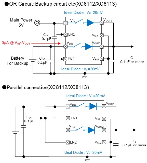The XC8112 series is equipped with 2ch 500mA load switches, making it suitable for backup OR connections and multi-channel applications in small, power-saving uses. The XC8113 series features 2ch 1A load switches, ideal for small, high-current applications and further reducing voltage drop (low ON resistance) through parallel connections (Figure 2).