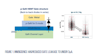 A silicon device normally has a blocking oxide below the gate to block the gate leakage. In GaN, this oxide layer is not present, so a two-diode back-to-back architecture is used (see Figure 1). By optimising the epitaxy, the processing and the architecture, Innoscience has reduced the leakage characteristic by nearly 10x, to under 3μA at 85°C for the device’s lifetime, making VGaN HEMTs suitable for use as the load switch inside mobile handsets.