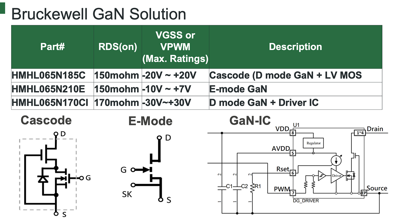 In order to provide customers with design flexibility, Bruckewell has developed the HMHL065N185C, a product based on a “normally on” GaN switch and a “normally off” Si MOSFET for the gate realization, resulting in a common “normally off” component. Bruckewell had the cost structure in mind here, as GaN “normally on” switches are less expensive to manufacture. The compatible gate voltage range of +/-20V is achieved.