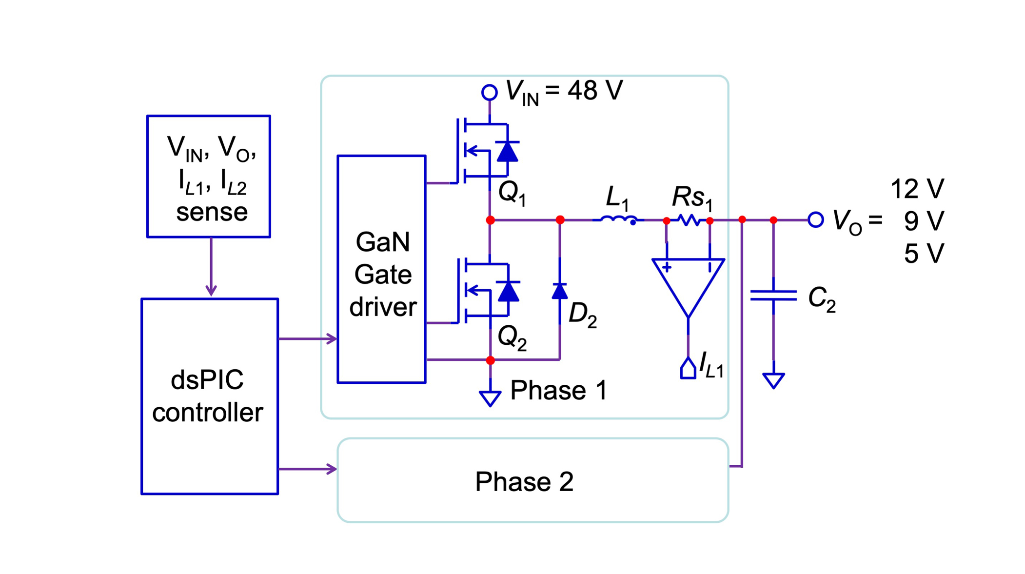 There are two options for the digital control loop, either a multi-loop controller or single voltage loop with phase current balancing. Both options require current sensing circuitry, consisting of sense resistors and differential amplifiers. In this design, 1mΩ sense resistors and low-noise amplifiers MCP6C02 were used. The multi-loop controller uses a single voltage loop providing the same current reference (IREF) to the two independent inner current loops. As a result, the current in both inductors will be regulated to the same value. The bandwidth of the two inner current loops are set to 10kHz and the outer voltage loop bandwidth is set to 2kHz.