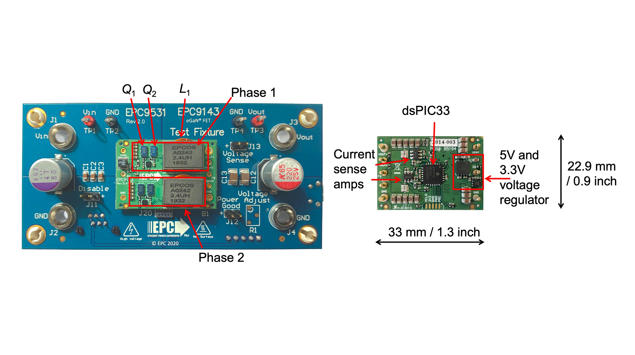 Figure 2 shows a photo of the 1/16th brick converter (EPC9143) mounted on the EPC9531 test fixture. The power stage components (gate drivers, GaN FETs and inductors) are on the top side, and control components (current sense amplifiers, digital controller) are on the reverse.