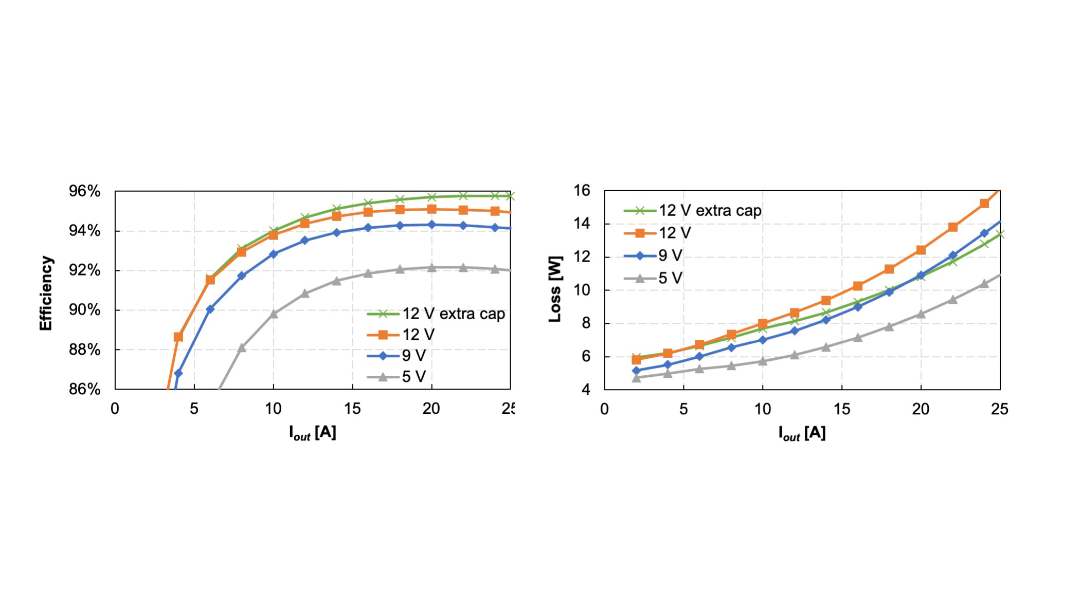 Due to space limitation, the brick converter can only fit a total of 8.2µF input capacitance. When an additional 2µF capacitance is added, the peak efficiency is improved to 95.8%, and the loss is reduced by 2.7W (15%).