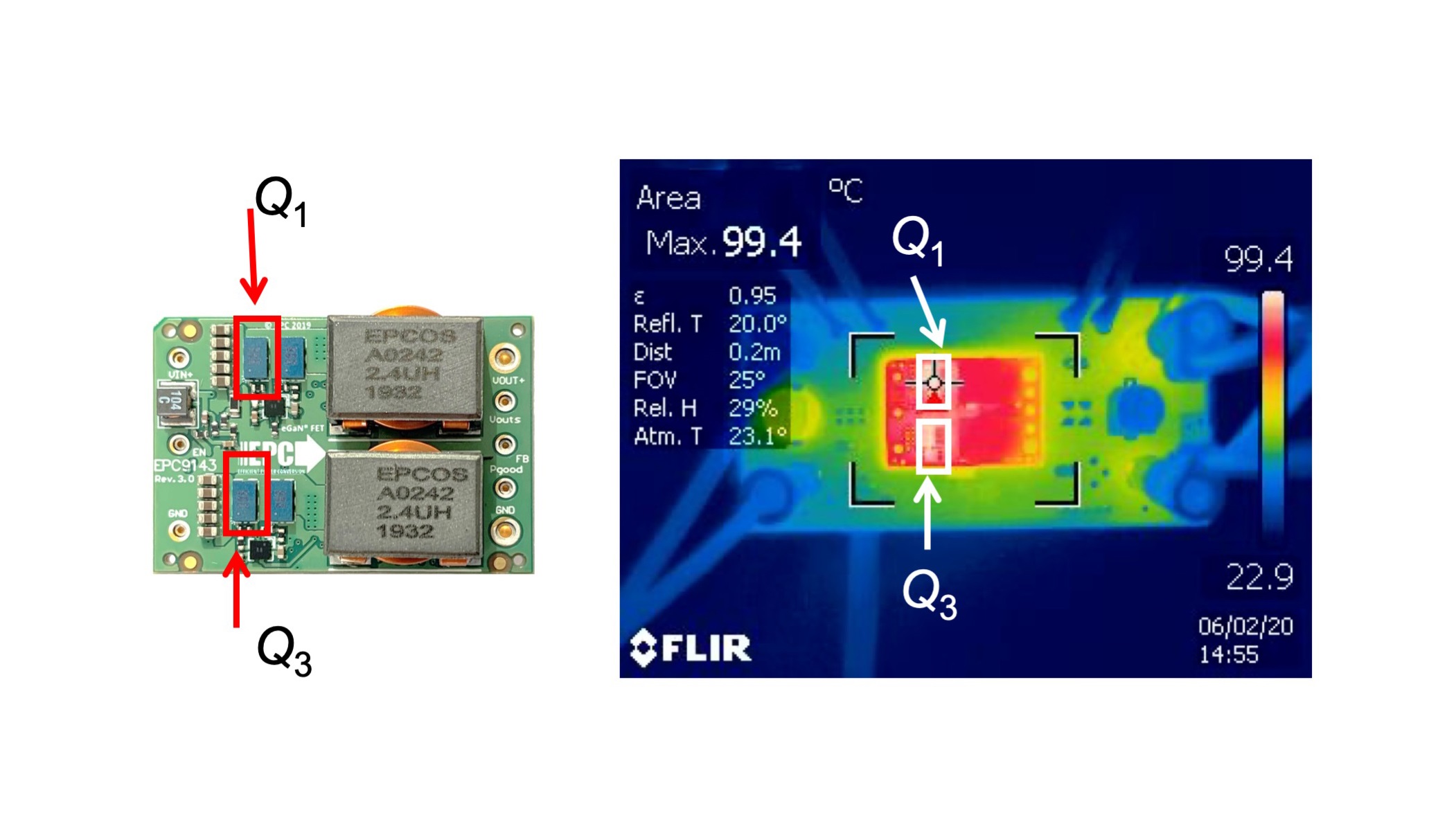 Figure 2: 1/16th brick converter EPC9143 mounted on the EPC9531 test fixture (left) and bottom side of the converter