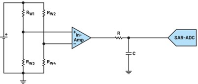 Figure 1 – A schematic diagram showing a simplified bridge measurement circuit combined with an in-amp and a SAR-ADC.