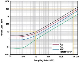 The function of a SAR-ADC can be divided into two phases: the data acquisition phase and the conversion phase. Basically, in the data acquisition phase, the current consumption is low. Most SAR-ADCs even power down between conversions. So, the conversion phase draws the most current. The power consumption is dependent on the conversion rate and linearly scales with the sample rate. For power-saving applications for slow-response measurements – that is, measurements in which the measured quantities change slowly (for example, temperature measurements) – a low conversion rate should be used to keep the current draw and thus the losses low. Figure 2 shows the power losses in the AD4003 at various sampling rates as an example. At 1kSPS, the power loss is approximately 10µW; at 1MSPS, it has already risen to 10mW.