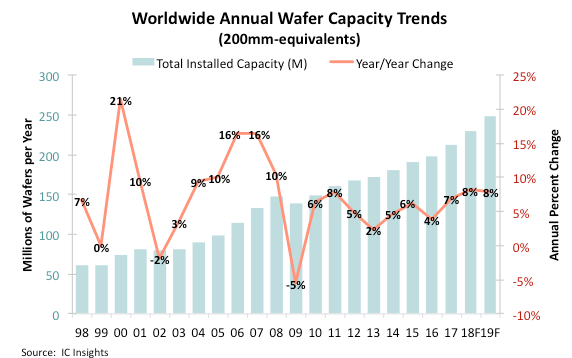 Since 2010, annual changes in wafer capacity volume have been in the relatively narrow range of 2-8%, with the largest year-to-year difference being just three percentage points.