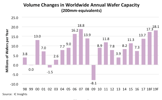 If all the new fab capacity expected to be brought on-line in 2019 happens as planned, the volume of capacity added that year will approach the record set in 2007.