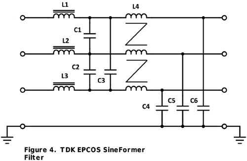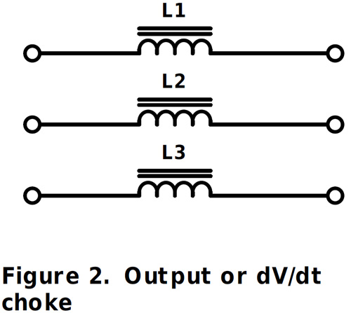 Filters on the output of the inverter are the solution to these problems with several types available depending on the severity of the effects. Simple in-line chokes as shown in Figure 2 reduce the differential noise by increasing the rise time of voltage pulses which limits stress on the motor insulation and reduces motor noise but without reducing common mode electrical noise. Shielded cables to the motor are typically still required to meet EMC standards. Common-mode leakage currents through motor bearings are also not reduced. This simple solution can be effective though, with cable lengths up to about 50m if bearing currents are minimised by careful earthing arrangements. The filter does have to pass the full motor drive current without saturation or overheating. Parts in the B86301U*R000/S000 range from TDK EPCOS would be suitable examples with current ratings up to 1500 amps.