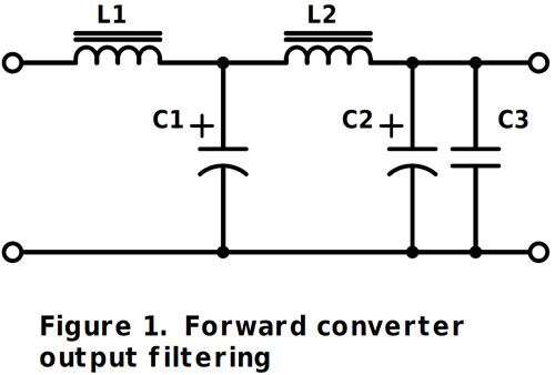 Filtering for DC outputs is well understood and usually comprises simple LC networks to provide energy storage where necessary and reduce differential noise down to acceptable levels. Figure 1 shows a typical output stage for a forward or ‘buck’ converter used at high power. L1 is sized in inductance to give a fixed ripple current for fixed frequency giving a ripple voltage across the ESR of C1. L1 has to pass the peak output current without saturation. This means it is often quite a large component comprising a powdered iron or gapped ferrite core. However, noise spikes may pass through with little attenuation due to the inductor’s high self-capacitance. L2 and C2/C3 form a low pass filter to attenuate noise. L2 can be quite small in value but must still pass the full output current without saturation. In fact, L2 should not be oversized in inductance as operating load current-steps through it produce unwanted voltage steps according to E = -Ldi/dt. C3 is sometimes added, as a parallel combination of an aluminium electrolytic and film capacitor provides low impedance across a wider range of frequencies. Sometimes filtering is also added to reduce common mode noise between output and local ground. At lower power, when a flyback or buck converter is used, energy is stored in an inductive component equivalent to L1 further back up the power train. L2 and C2/C3 may still be included though to reduce noise.
